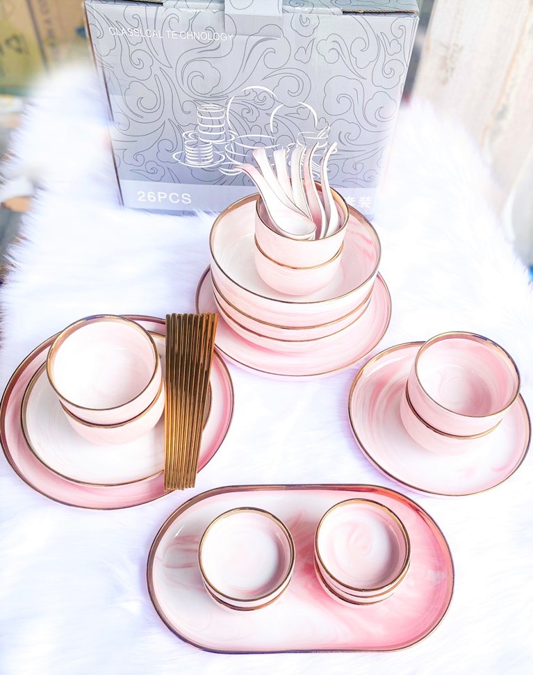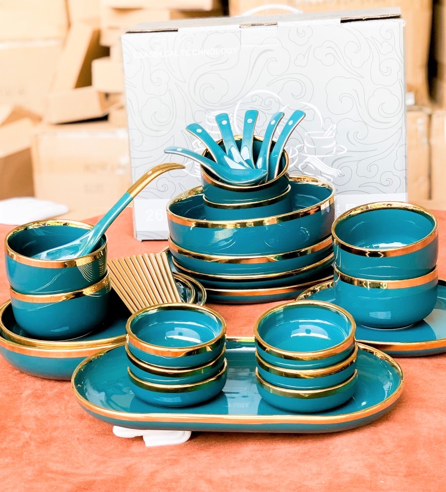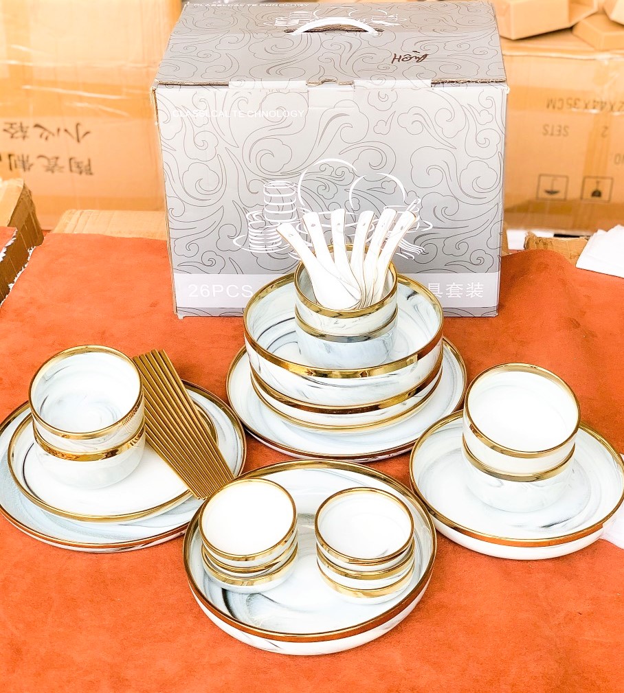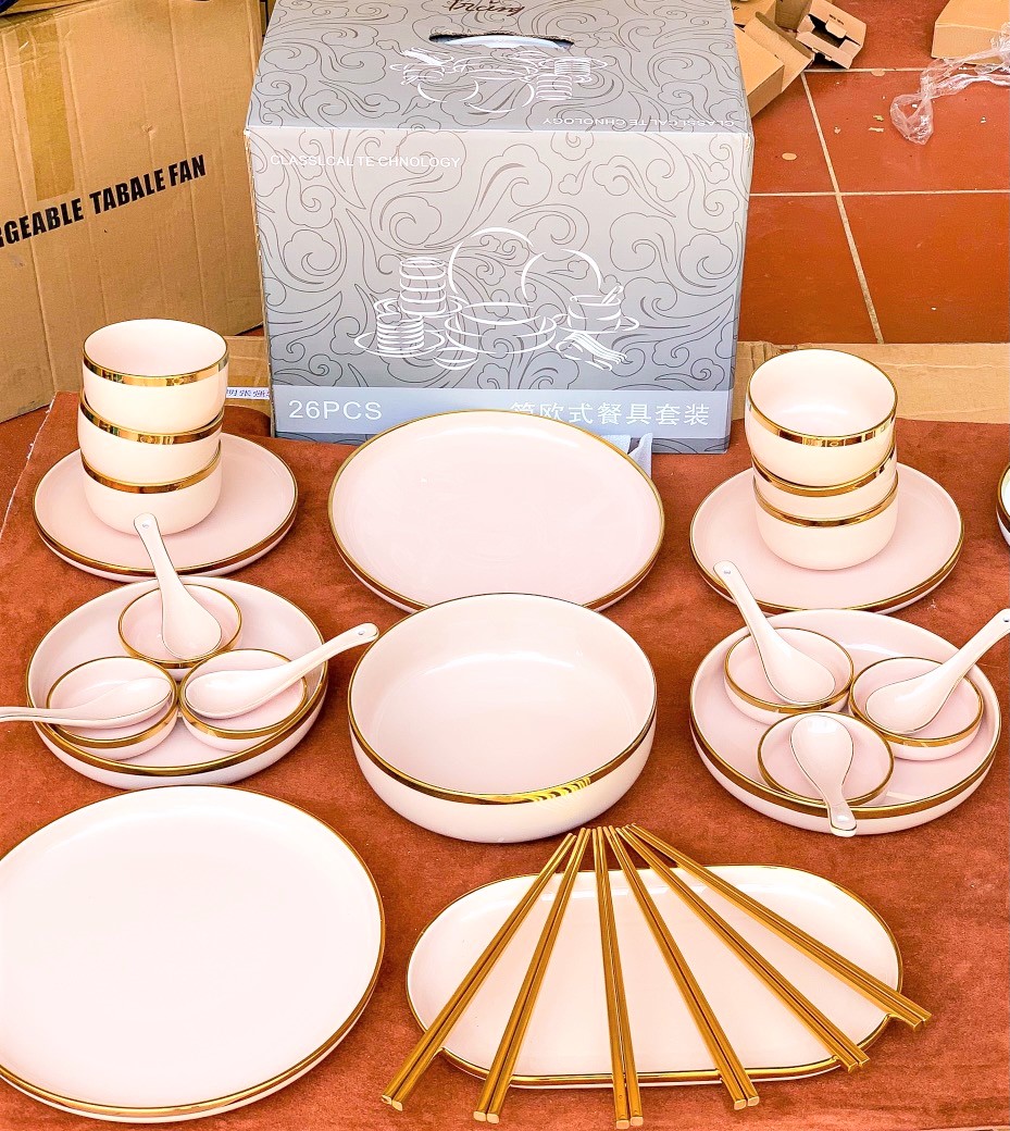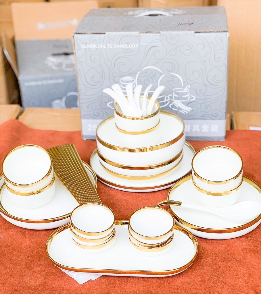 ⚜ Bộ bát đĩa sứ, Set bát đĩa 26 món viền vàng bao gồm: - Chất liệu: Gốm sứ + Bát ăn cơm: 06 cái + Bát canh: 01 cái + Bát gia vị: 06 cái + Đĩa nhỏ: 02 cái + Đĩa lớn: 02 cái + Đĩa sâu nhỏ: 02 cái + Đĩa sâu lớn: 01 cái + Thìa cơm: 06 cái